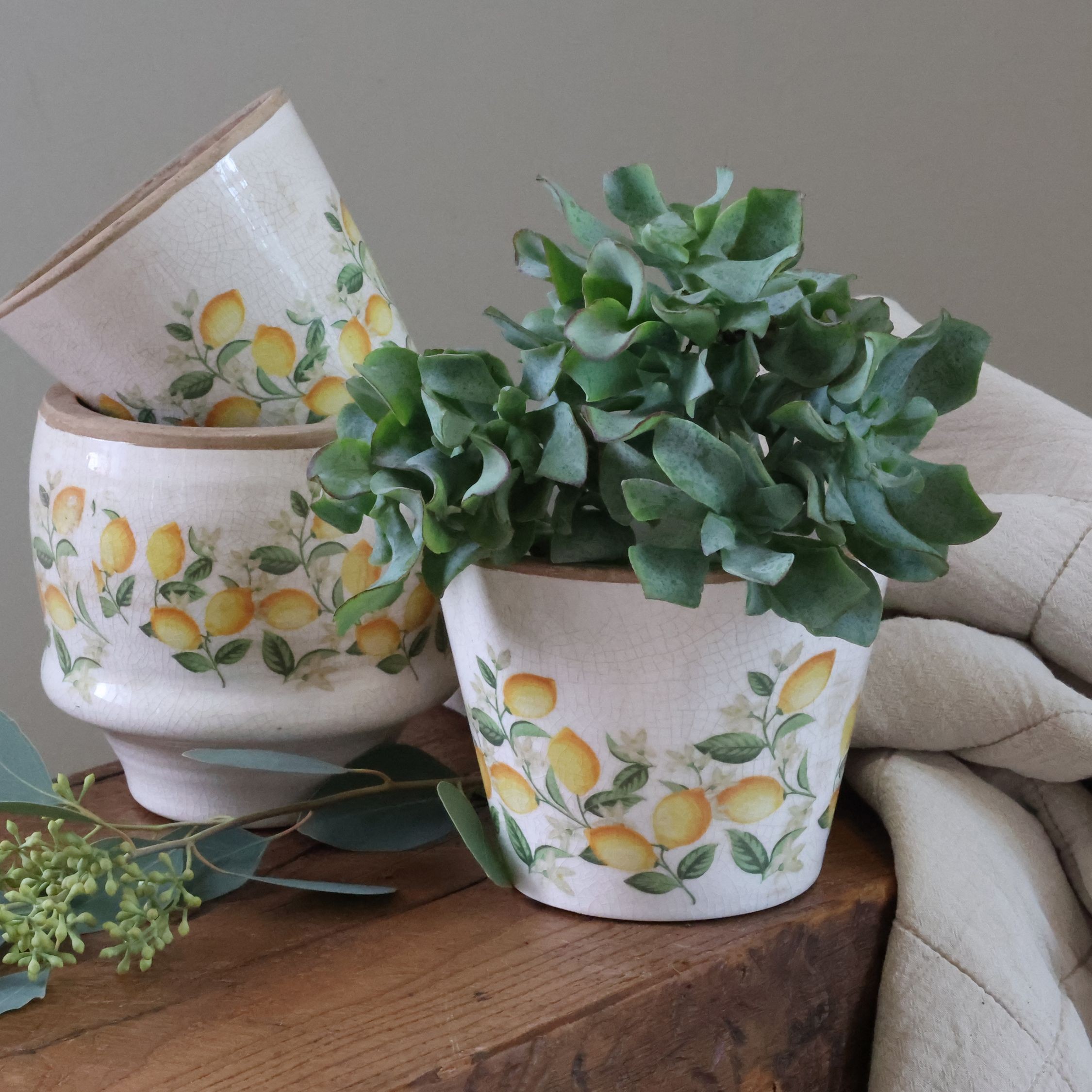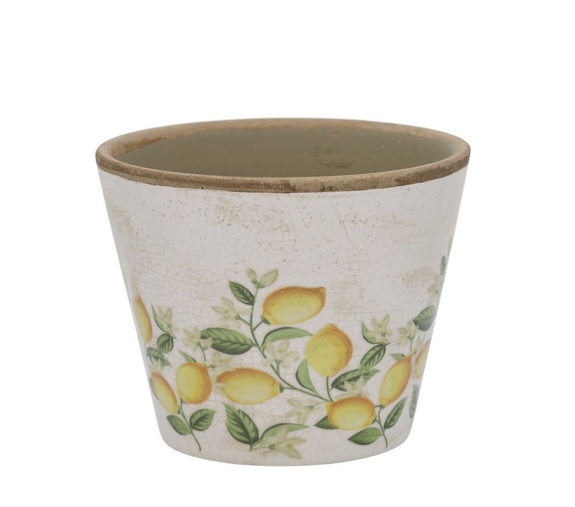 Dodejte svým rostlinám šmrnc a přeneste si kousek slunné Itálie přímo k vám domů! Tento okouzlující keramický květináč z oblíbené kolekce Limone Blossom je dokonalým spojením středomořského temperamentu a venkovské elegance. Světlý béžový základ s jemnou antik patinou a tmavším lemem tvoří perfektní pozadí pro svěží motiv šťavnatých žlutých citrónů a zelených lístků.