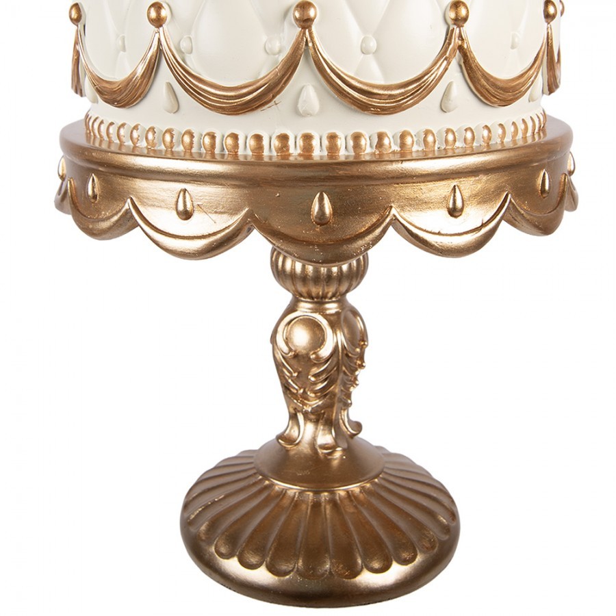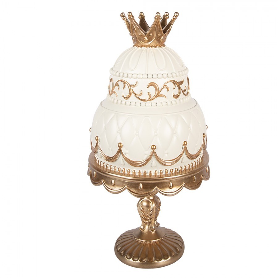 Oslnivý design s důrazem na detail Dekorace na první pohled zaujme svým velmi propracovaným vzhledem. Základ tvoří zdobený stojan ve zlaté barvě, na kterém spočívá dvoupatrový „dort“ v jemném krémově béžovém odstínu. Celý kousek je bohatě lemován elegantními zlatými ornamenty, vlnovkami a drobnými detaily. Pomyslnou třešničkou na dortu je majestátní zlatá korunka na samotném vrcholu.