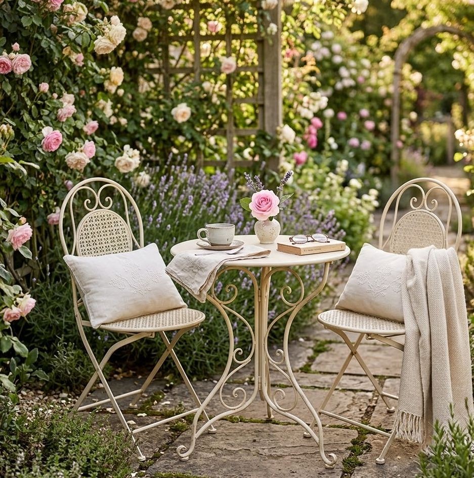 Vytvořte si útulné místo pro ranní kávu nebo odpolední relaxaci s tímto elegantním kovovým bistro setem. Tento stylový zahradní nábytek s nádechem francouzského venkova a provensálského stylu je ideální volbou na balkony, terasy, do zimních zahrad i do menších venkovních zákoutí.