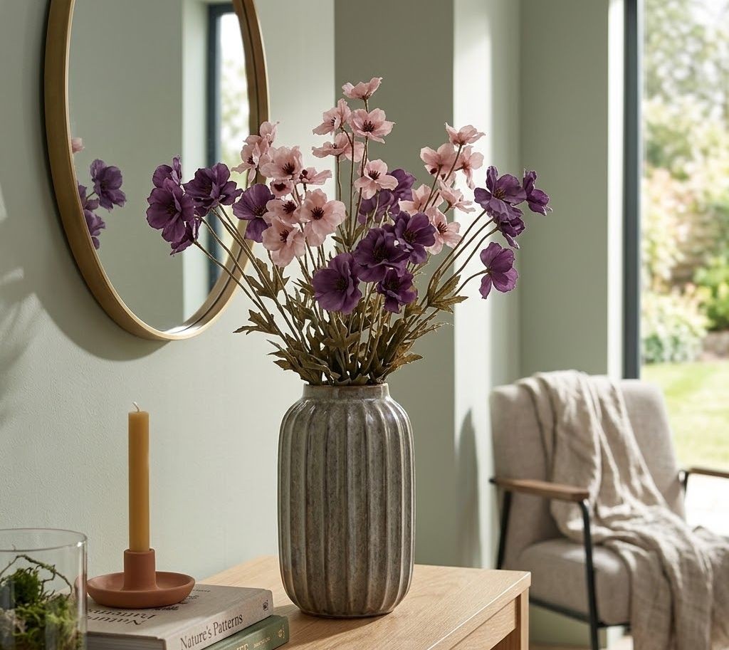 Hledáte dokonalou dekoraci pro vaši oblíbenou vázu? Tato vysoká umělá květina je ideální volbou. Její květy v tlumené, starorůžové barvě s kontrastním tmavým středem působí neuvěřitelně realisticky a křehce. Doplněna je o detailně zpracované lístky a pevný stonek v přirozených zemitých tónech zelené a hnědé.