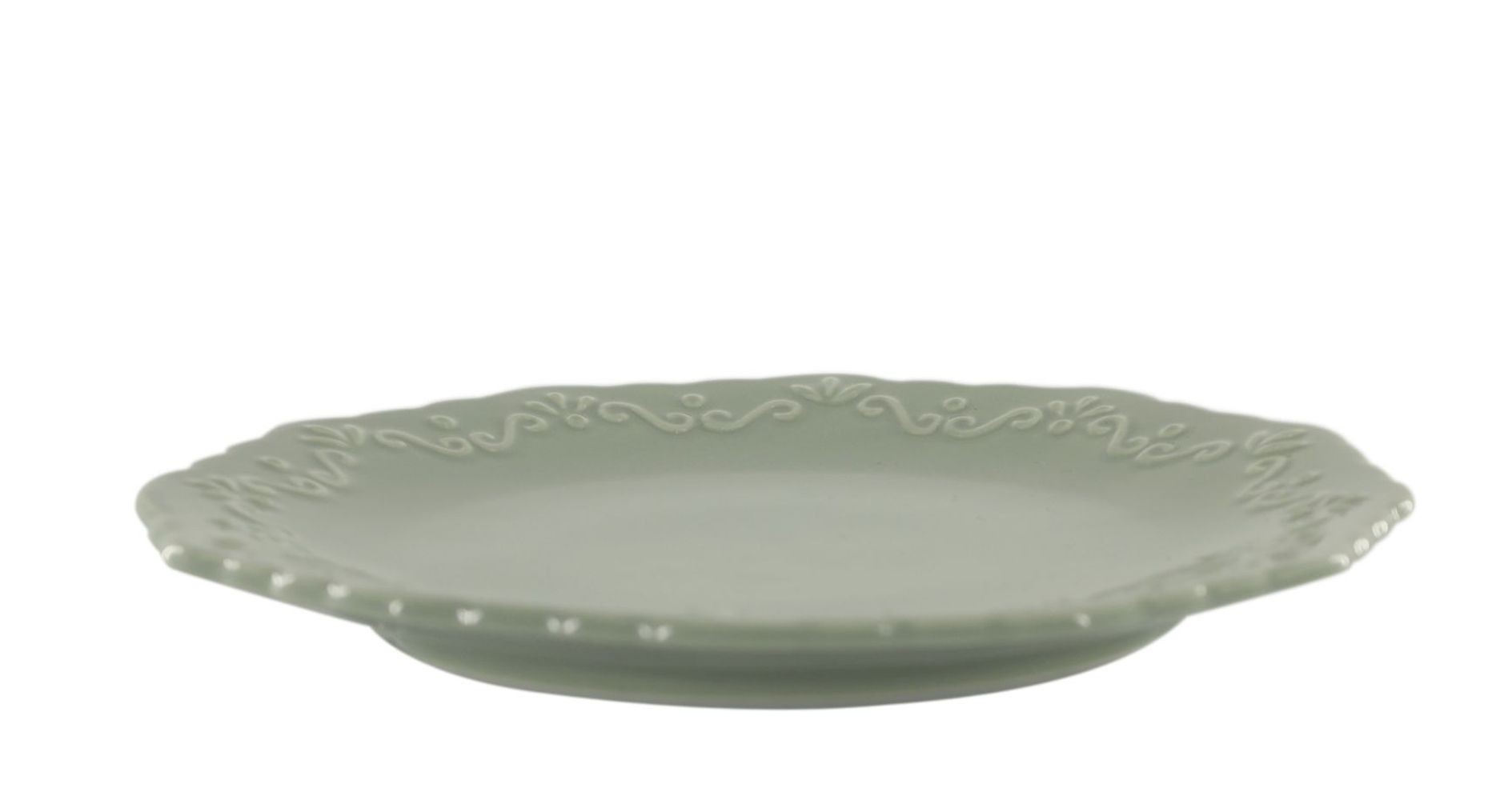 Dodejte svým sladkým tečkám i každodenním snídaním nádech francouzské elegance. Tento nádherný porcelánový dezertní talíř z kolekce Provence Lace Verte vyniká svou jemnou pastelově zelenou barvou a detailním reliéfem na zvlněném okraji, který dokonale evokuje romantickou krajku.