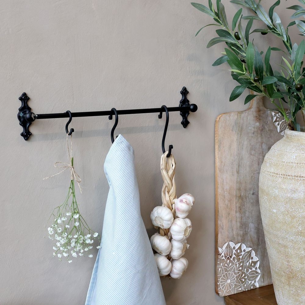 Dodejte svému interiéru špetku dramatické elegance a dokonalé organizace. Nástěnná závěsná tyč Terrié v nádherném černém provedení je přesně tím detailem, který propojuje historický šarm s moderními trendy. Ať už ji umístíte do koupelny, nebo do kuchyně, okamžitě povýší vzhled celé místnosti.