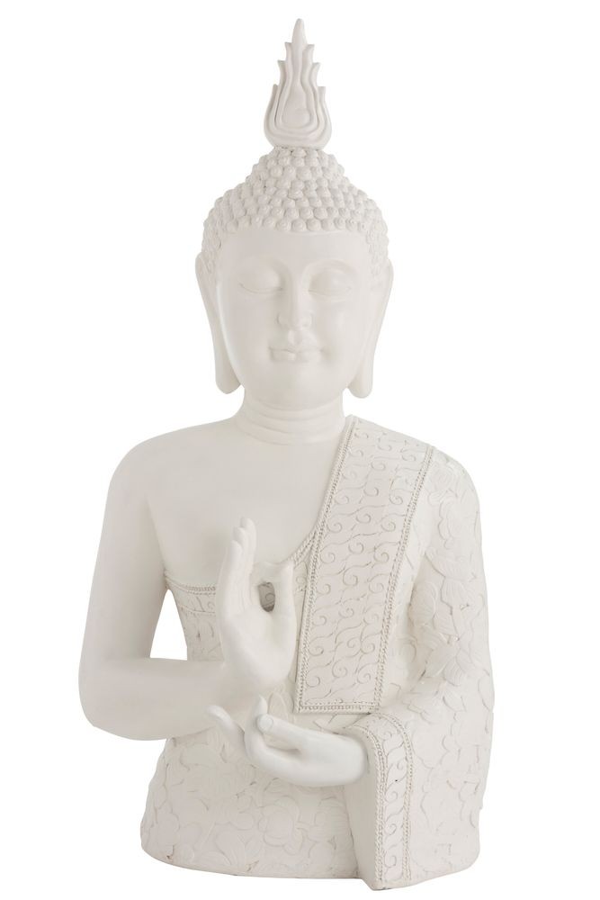 Socha je vyvedena v čistém, světlém (bílo-krémovém) odstínu, který prostor projasní a dodá mu na eleganci. Buddha je zachycen v tradičním ochranném a uklidňujícím gestu, které do vašeho domova vnese pozitivní energii.