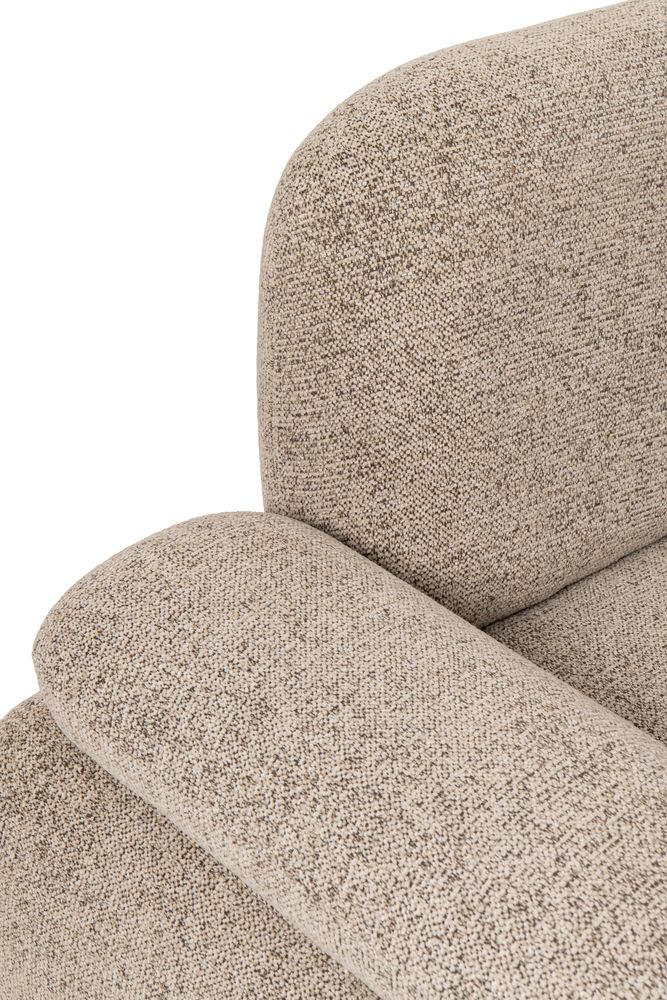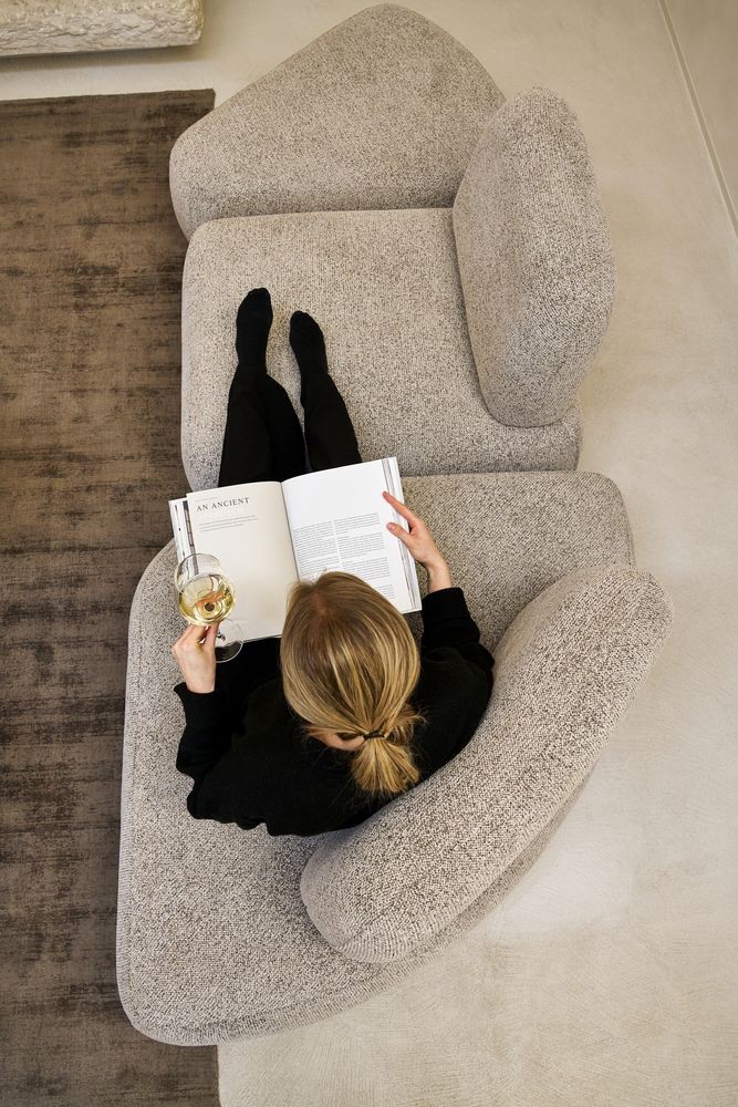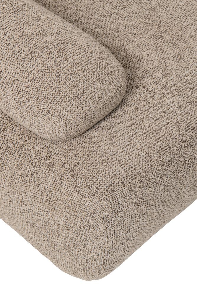 Pohovka je čalouněna vysoce kvalitní, na dotek neuvěřitelně příjemnou texturovanou látkou připomínající oblíbené bouclé. Nádherný, jemný odstín ecru (světlá krémově-písková) prozáří váš obývací prostor a skvěle se kombinuje s přírodními materiály, jako je dřevo či kámen. Samostatný taburet v atypickém trojúhelníkovém tvaru pak funguje jako skvělý designový solitér nebo podnožka.