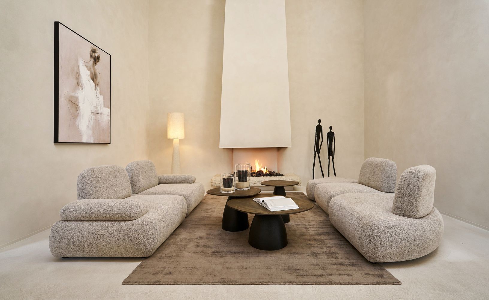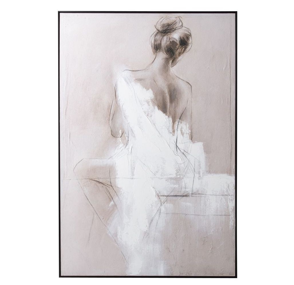 Ústředním motivem tohoto impozantního uměleckého díla je ženská silueta zachycená zezadu, ladně zahalená do splývavé bílé látky. Zpracování balancuje na pomezí jemné malby a abstrakce. Díky pečlivě zvolené paletě tlumených krémových, pískových a pudrových tónů působí obraz neuvěřitelně lehce. Minimalistický tmavý rám pak celý výjev elegantně ohraničuje a dodává mu moderní kontrast.