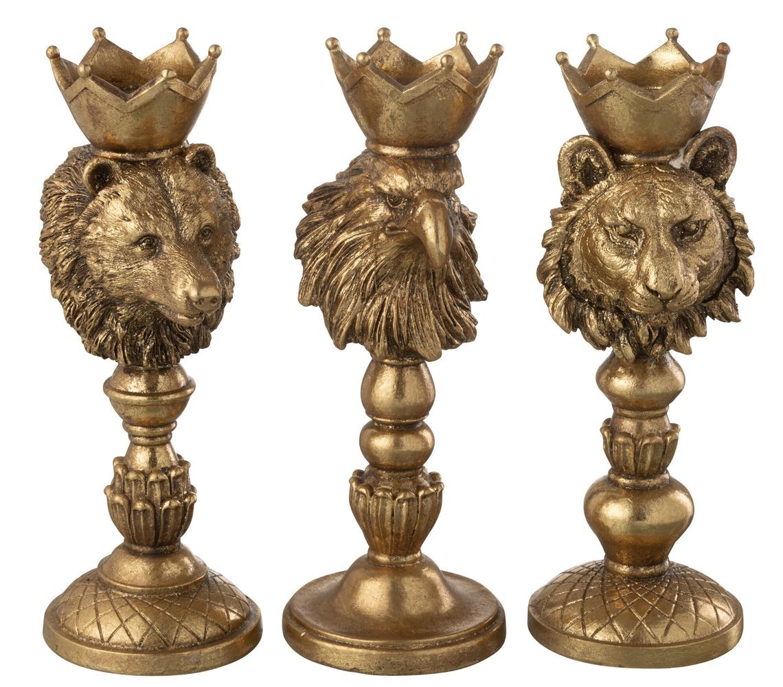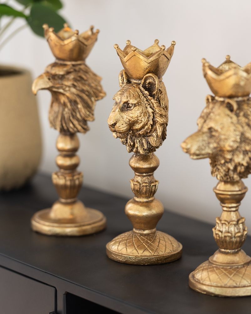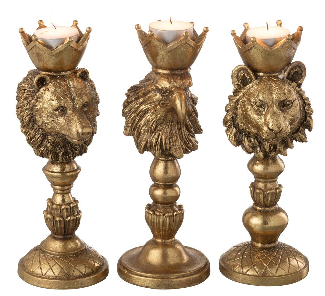 Vneste do svého interiéru kapku extravagance a majestátní atmosféry. Tento nepřehlédnutelný set tří svícnů ve starožitném zlatém provedení představuje mocné zástupce zvířecí říše – hrdého orla, silného medvěda a divokého lva. Každá z velmi detailně propracovaných zvířecích hlav je usazena na zdobném podstavci a pyšní se královskou korunou, která důmyslně slouží jako kalíšek pro čajovou svíčku.