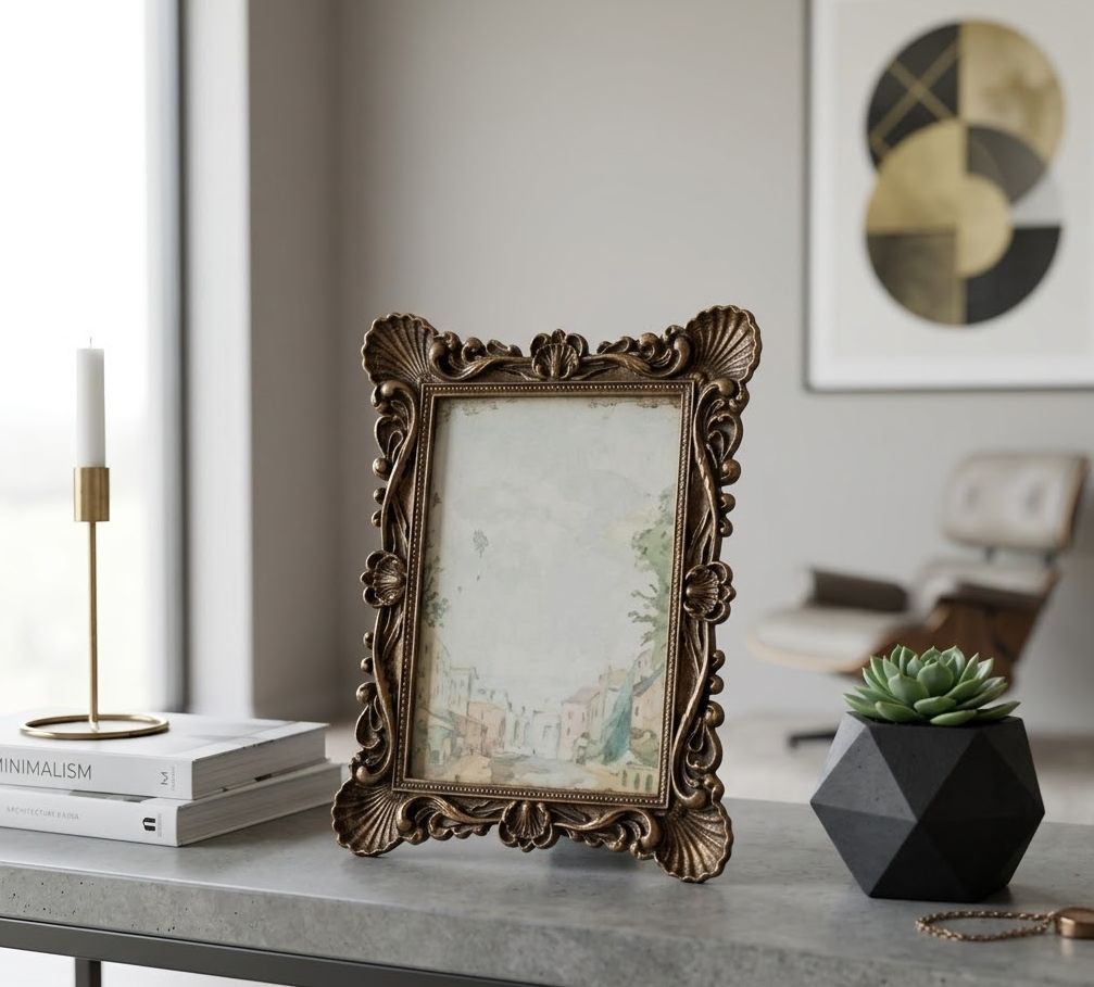 Antická bronzová barva s výraznou tmavou patinou dodává rámečku autentický starožitný vzhled a hloubku, která okamžitě upoutá pozornost. Je precizně odlitý z kvalitního polyresinu, což zaručuje jeho pevnost a dokonalé prokreslení každého detailu. Vaši oblíbenou fotografii, ať už jde o rodinný portrét, vzpomínku z dovolené nebo uměleckou pohlednici, pak bezpečně ochrání tabulka z čirého skla.